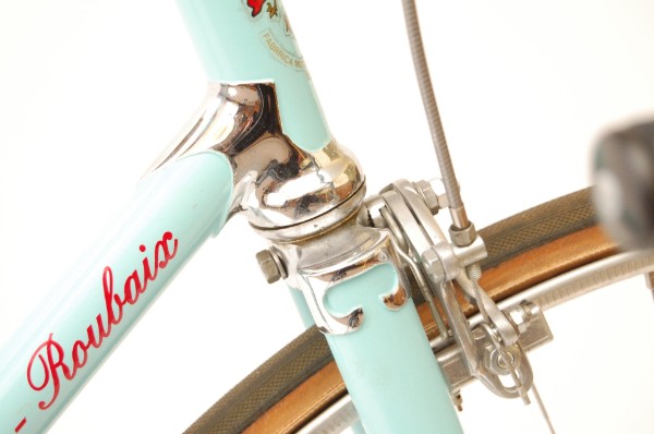 Bianchi Paris / Roubaix Italy, 1949 Professional road bike from Bianchi # 392708 finished in Bianchi celeste. Equipped with 1949 Campagnolo Paris Roubaix shifter, Universal brakeset, Ambrosio bar/stem and Nisi rims. Magistroni crankset fluted 4times,TA cain wheel with TA pro adapter, Sheffield pedals. Restored
